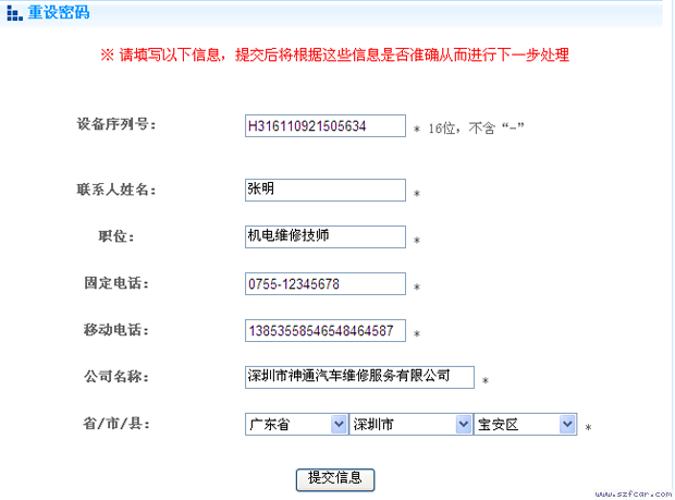如果您不记得你的用户名跟密码你可进入找回密码项,根据提示填写您正确的用户资料如图13-1所示,点击提交信息即可修改密码,修改完成后可直接使用您的机器序列号跟密码进行登录,也可进入您注册时填写的邮箱/Email获取用户和密码。